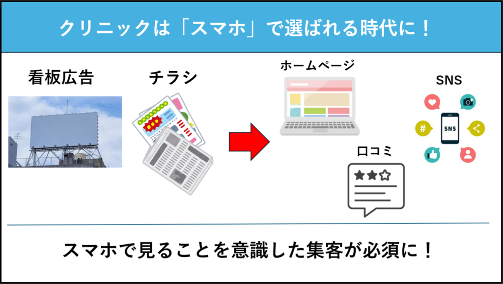 地域の人口変化や競合の増加といった外部要因ももちろんありますが、それ以上に重要なのが 「スマホ検索を起点とする医院選び」 が一般化したことです。