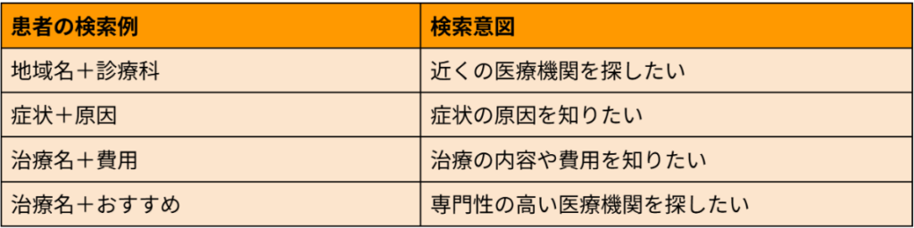 患者は「地域名+診療科」だけでなく、「症状」「治療方法」「専門治療」などのキーワードで検索されることも多く、そうした検索結果に情報が存在しなければ、クリニックを知る機会も生まれません。