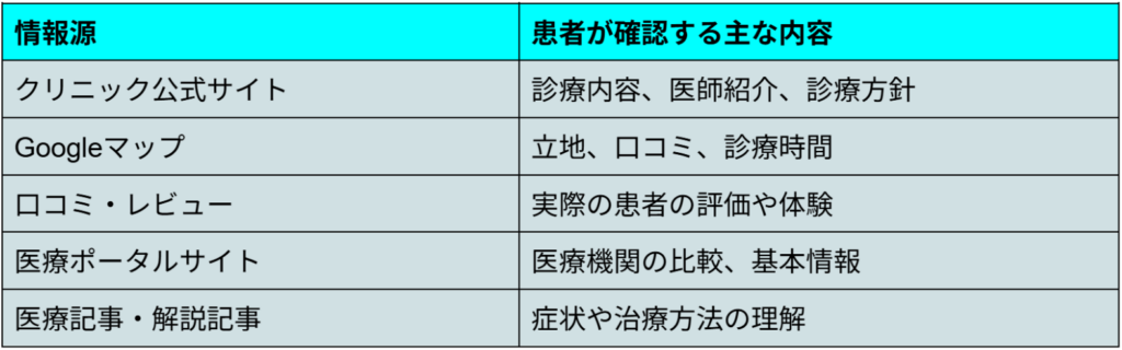 しかし現在では、多くの患者が来院前にインターネットで情報収集を行います。症状や治療方法を検索し、複数の医療機関を比較しながら、自分に合ったクリニックを探すことが一般的になりました。