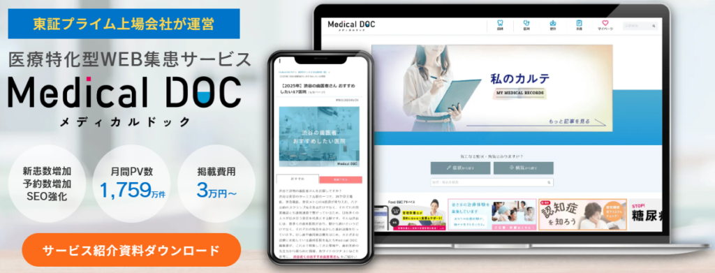 Medical DOCは、症状や治療方法、医療機関の情報などを発信する医療情報メディアで、月間1,700万PV以上のアクセスを集めています。症状や治療方法について検索する患者が多く訪れるため、医療情報を調べる過程でクリニックの存在を知るきっかけになることがあります。